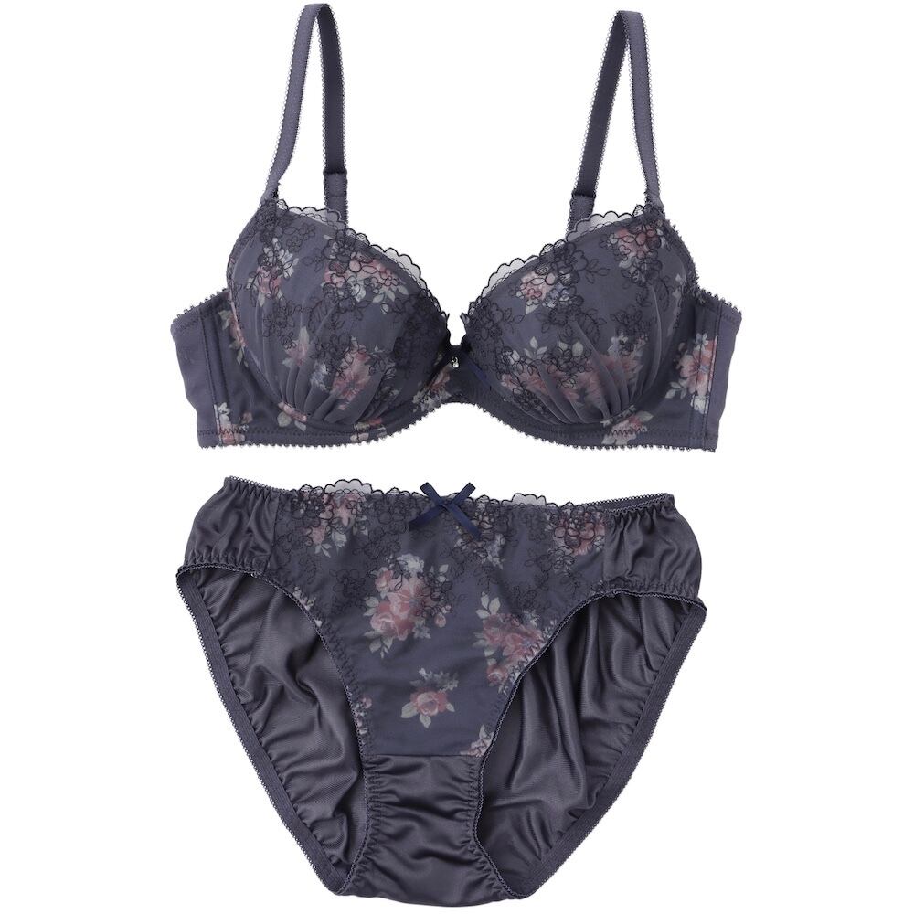 アンティーク調のバラ柄プリントとレースの組み合わせが大人可愛いブラとショーツの下着セットです。