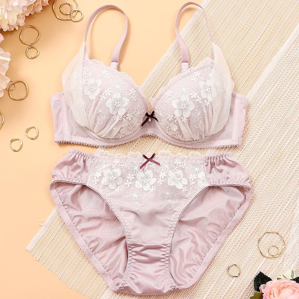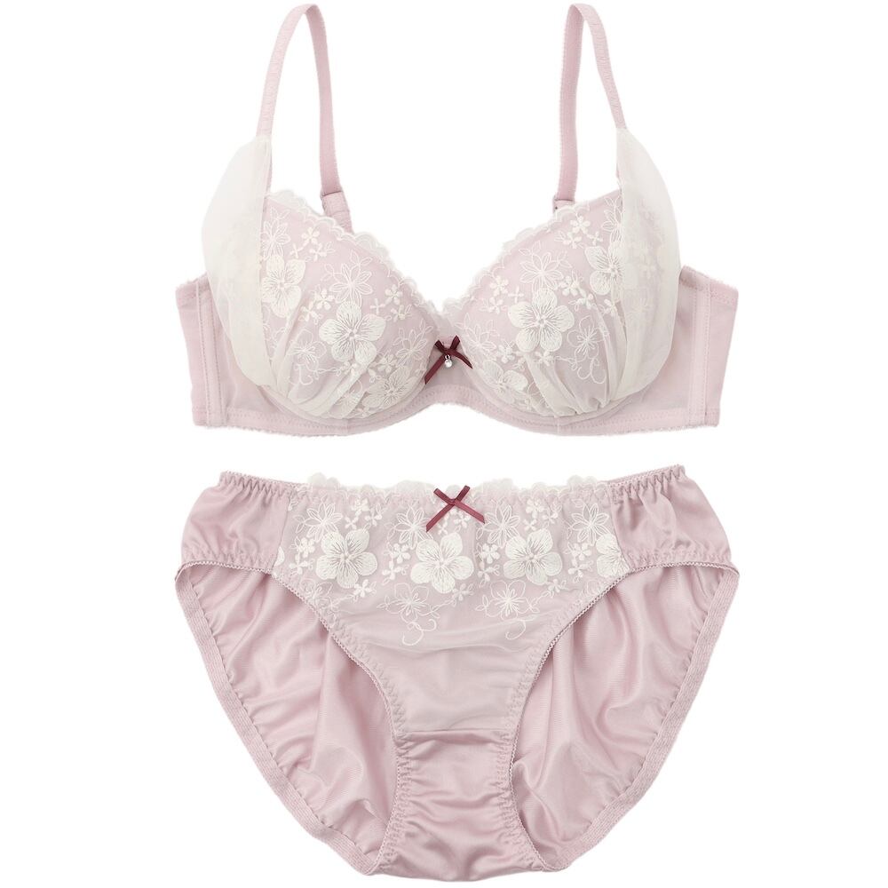 ウーリー糸を使用したふわふわ可愛いお花の刺繍とチュールレースのレイヤードがフェミニンな印象のブラとショーツの下着セットです。