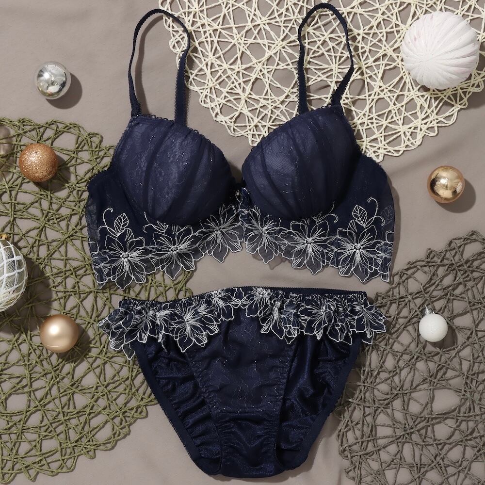 アンダー部分の花柄チュールレースが豪華なブラとショーツの下着セットです。