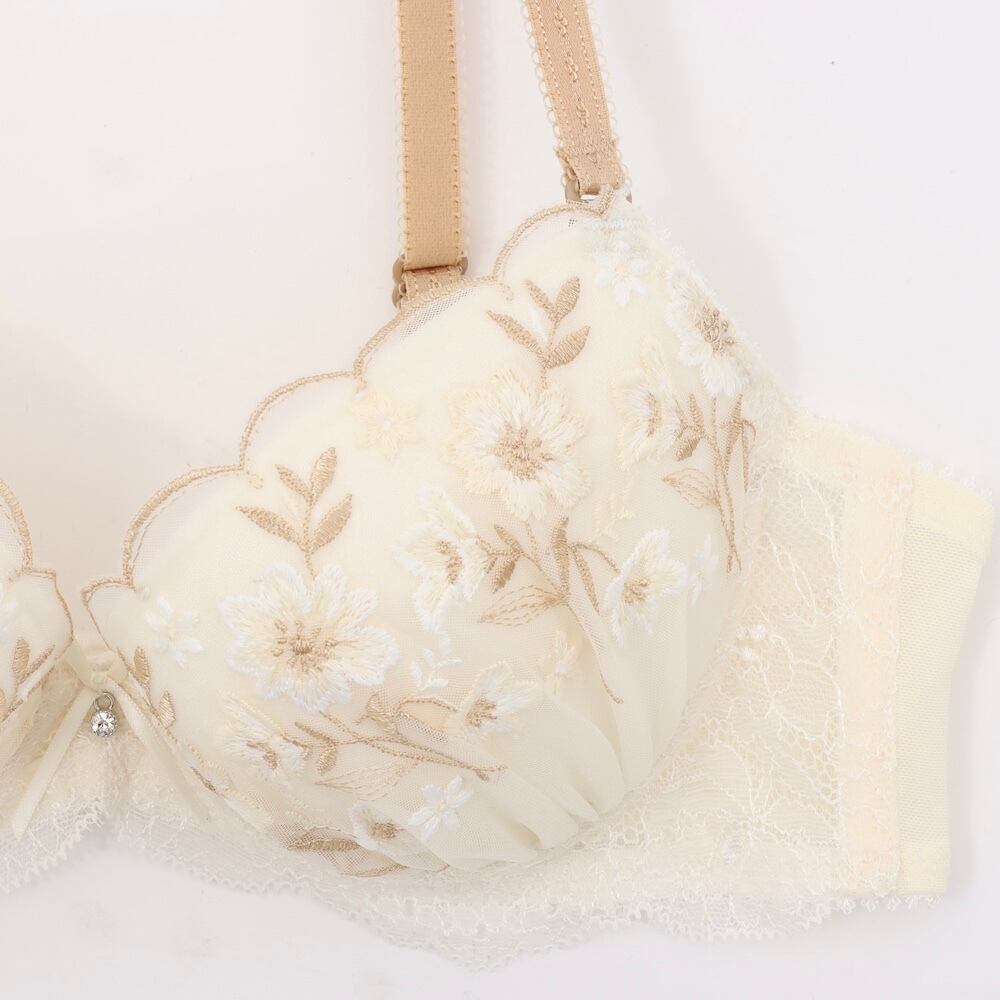 ウーリー糸を使用したお花の刺繍がふわふわ可愛いブラとショーツの下着セットです。