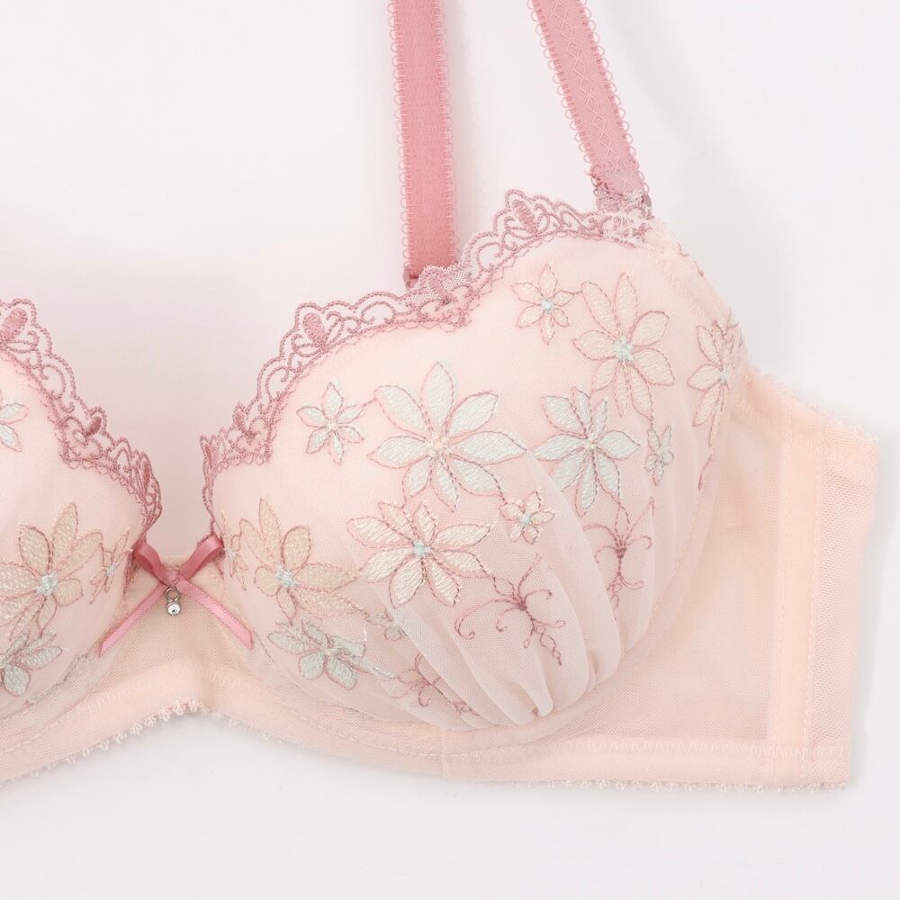 幾何学柄とマーガレットの刺繍レースが可愛いフェミニンなブラとショーツの下着セットです。