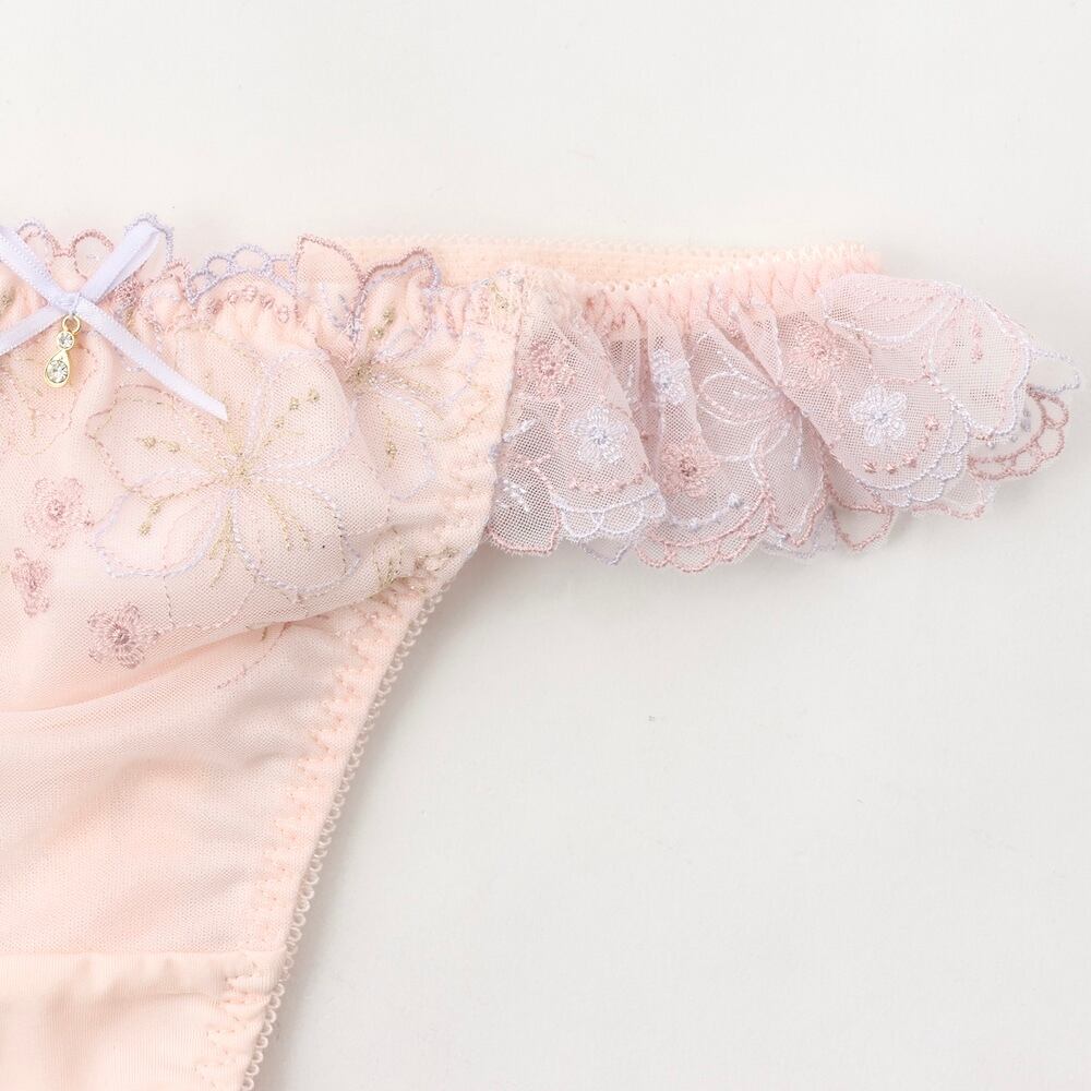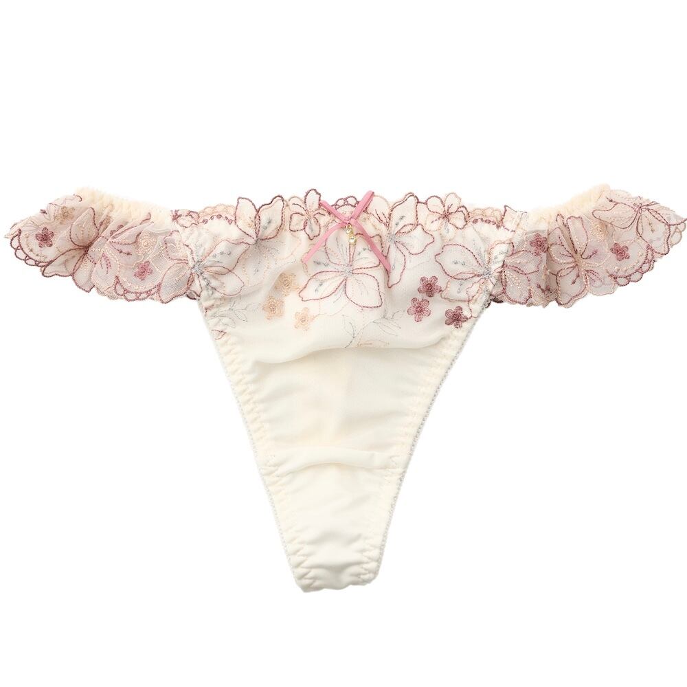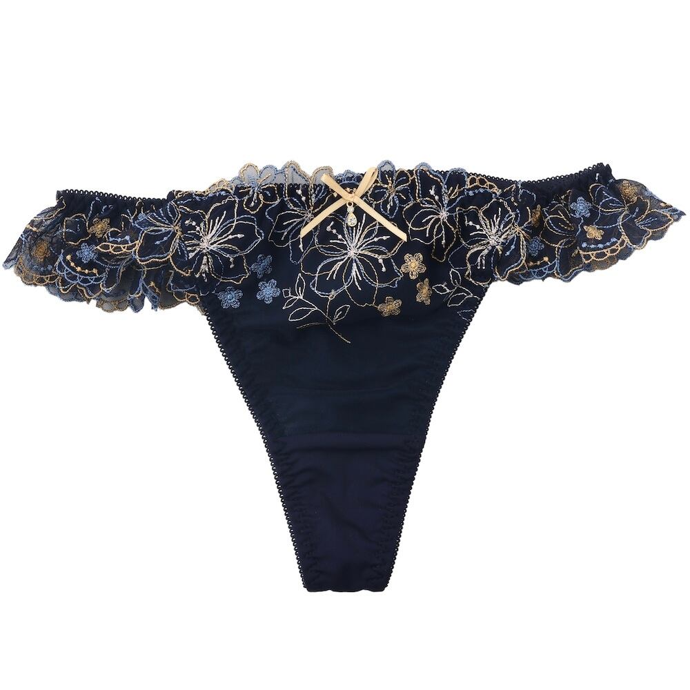 ラメ糸をほどこした線画の花柄刺繍レースがフェミニンなTバックショーツです。