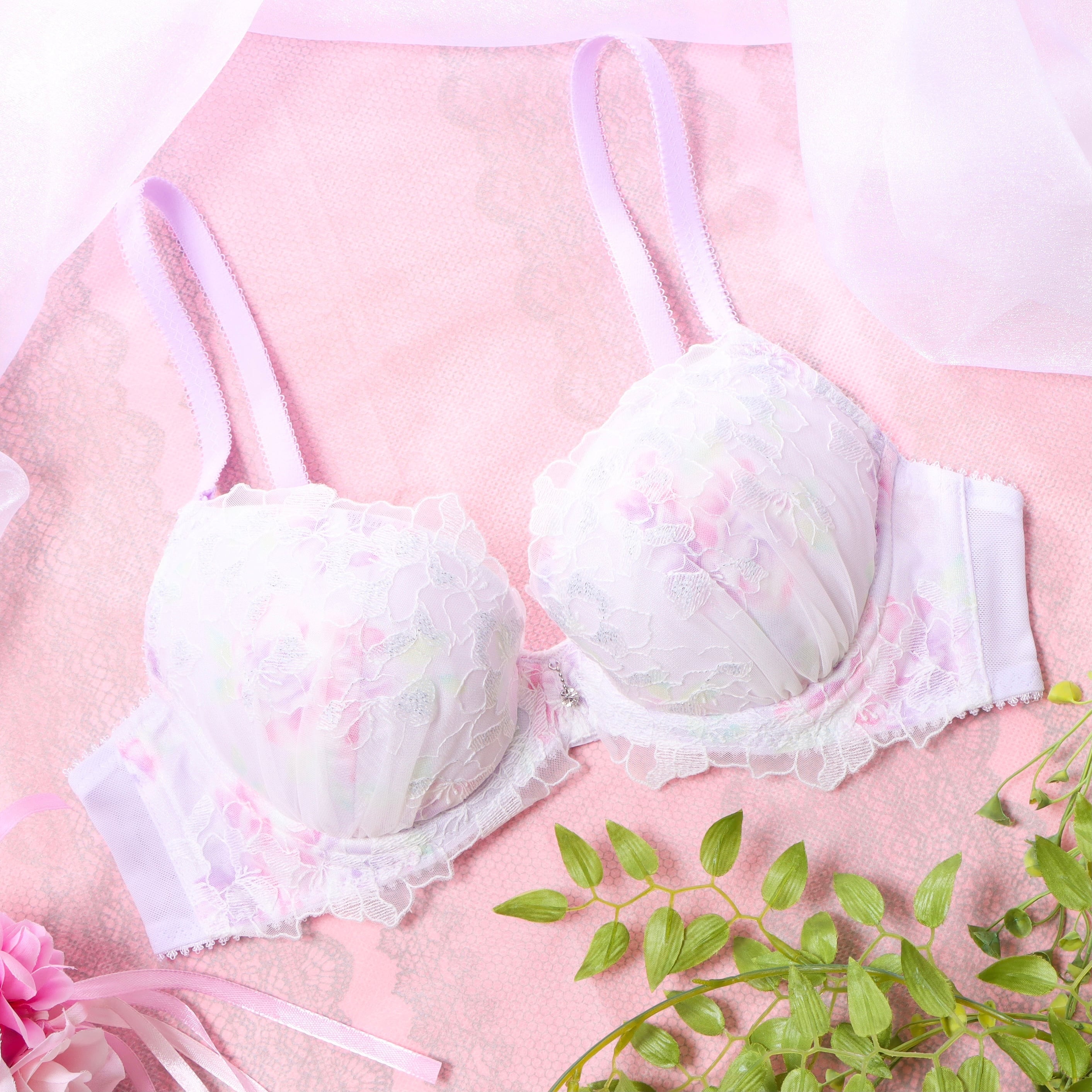パステルカラーの水彩花柄プリントに大花刺繍のレースをあわせた甘いデザインのブラジャーです。