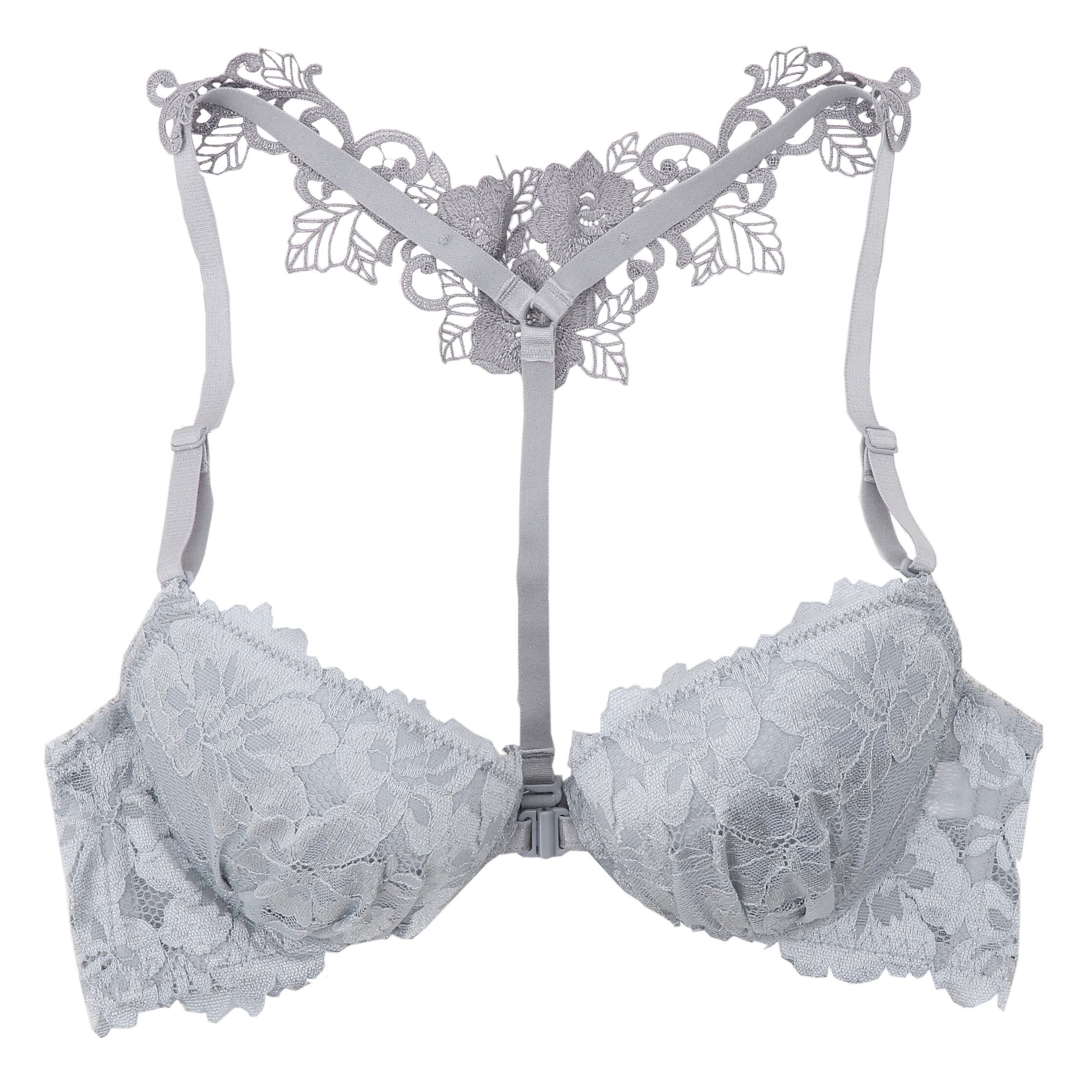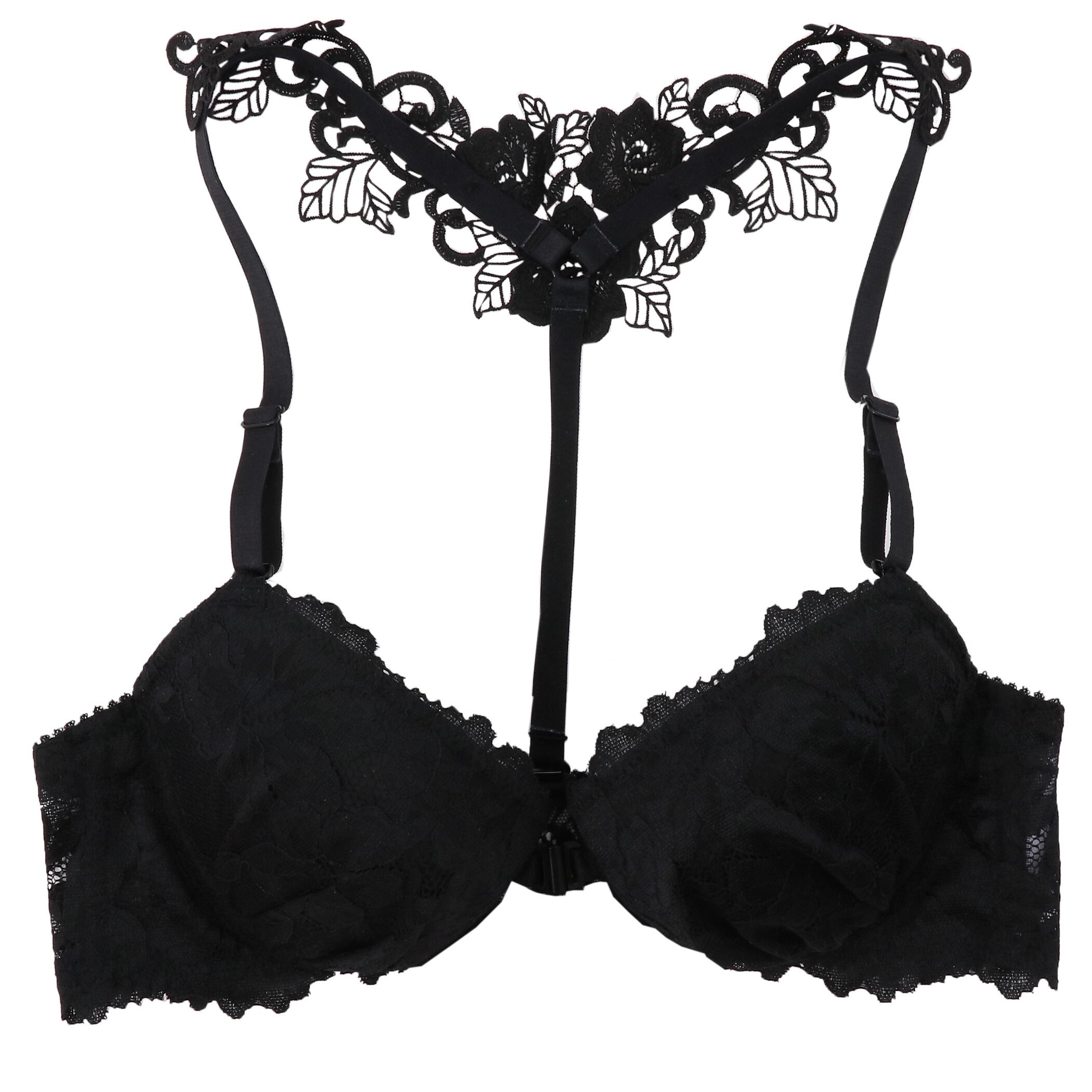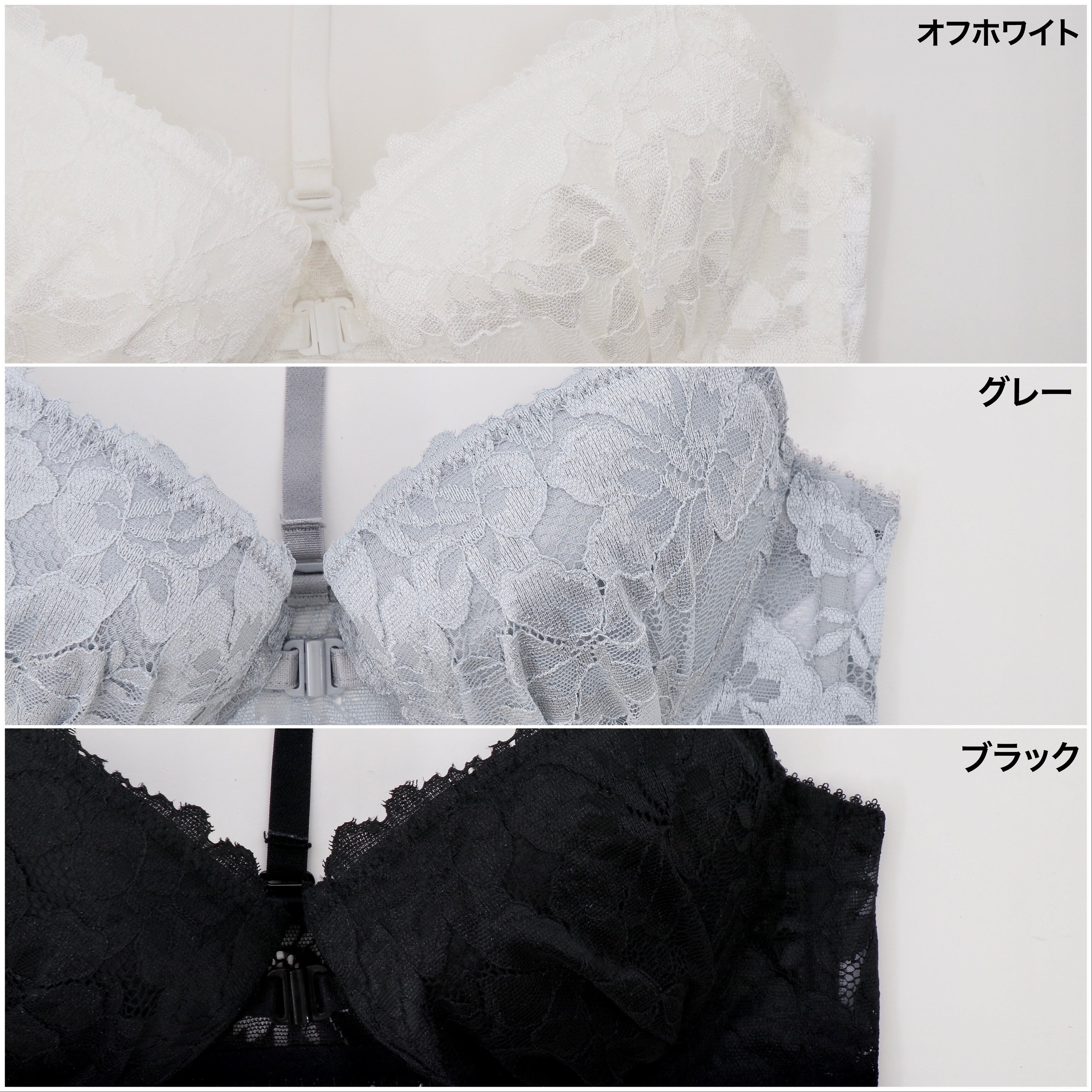 フロントホックで簡単に着脱できる、見えてもかわいいバックケミカルレースブラジャー。